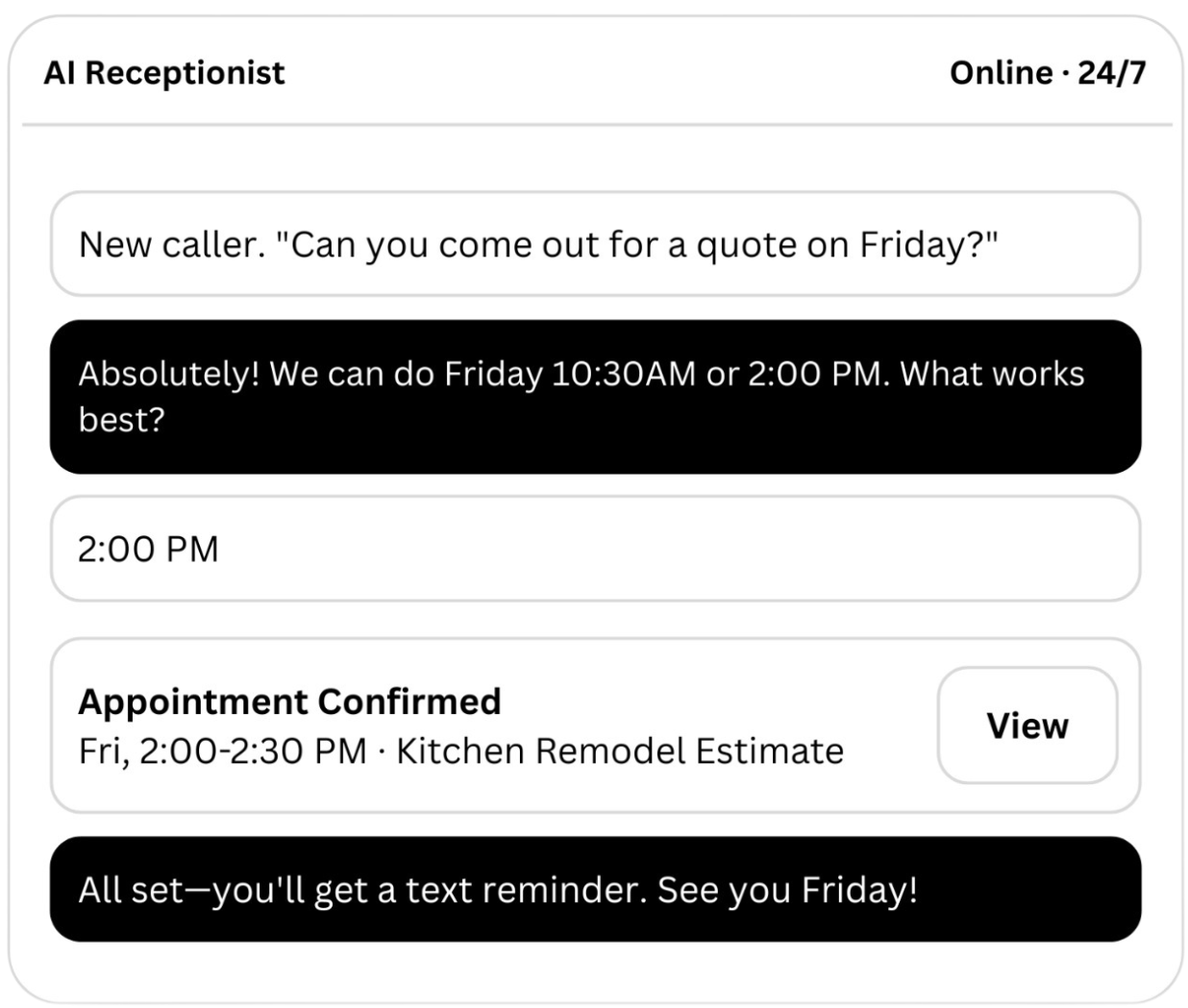 AI receptionist answers instantly, texts back every missed call, and books appointments while you’re on the job — evenings and weekends included.